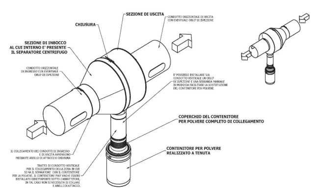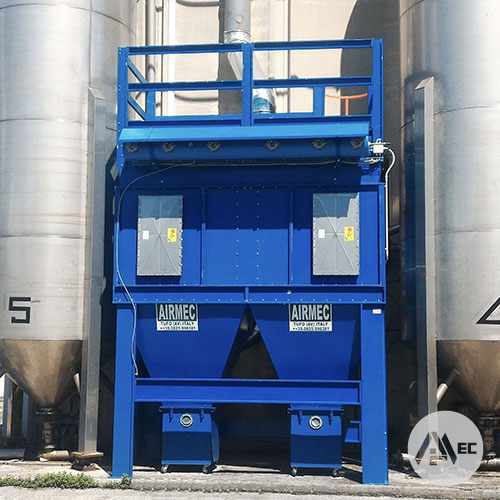 Le particelle fini invece risalgono il corpo e l’aria inquinata percorre i setti filtranti (cartucce in tessuto di poliestere anti- statico) dall’esterno verso l’interno, in tal modo la polvere si deposita esternamente, mentre l’aria risale e fuoriesce depurata. Il progressivo depositarsi di polvere rende necessaria la pulizia periodica delle cartucce che avviene per mezzo di elettrovalvole a membrana gestite da un programmatore ciclico con temporiz- zatore pausa-lavoro ; la sostituzione delle cartucce avviene fron- talmente attraverso sportello di ispezione.